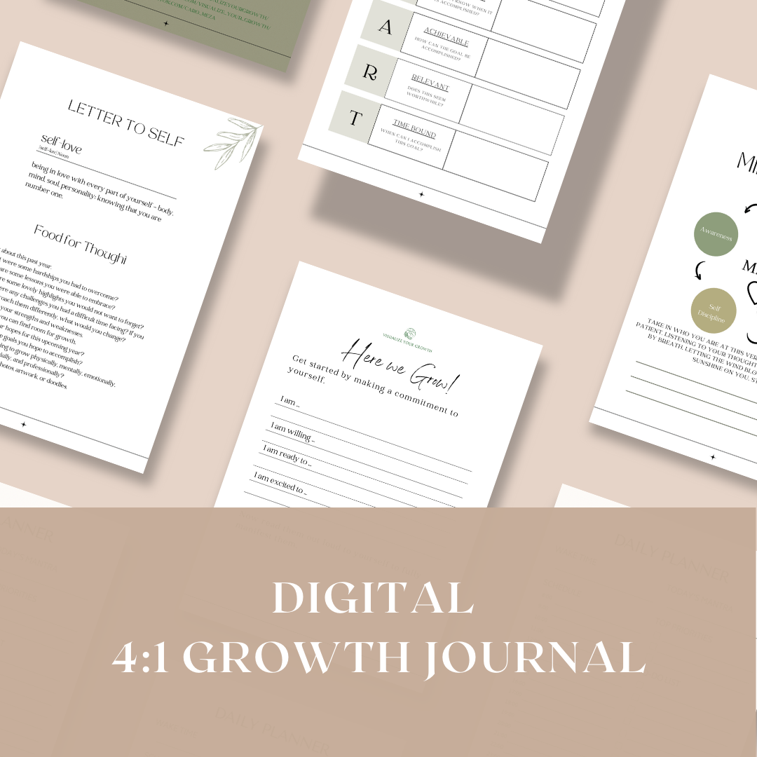 Our digital 4 in 1 Growth Journal is the ultimate confidence-booster to help you reach your personal growth goals. Reflection on your writing provides a sense of progress, while its digital format increases accessibility and is more eco-friendly. Blank pages foster creativity and a personal touch, lined pages offer structure and neatness, dotted pages blend creativity and organization, and prompts can help overcome writer's block. Whether for personal or professional use, the 4 in 1 Growth Journal offers increased versatility and flexibility to further growth and development. Learn more today.